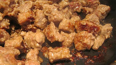 Trim excess fat from beef. Cut into bite size cubes. Dredge in flour, salt and pepper. Brown beef in 2 tablespoons olive oil over medium heat.