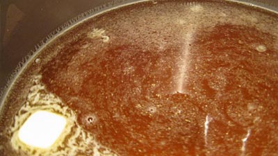 For the broth, combine beef broth, water, garlic powder, salt, pepper and tablespoon butter. Add browned beef to the broth and bring to a boil. Reduce to simmer. Simmer over low heat for 1 hour.