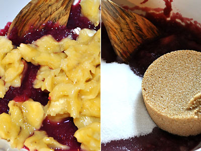Step 2: In a seperate large-sized bowl, mix together blueberry applesauce and smashed bananas. Add softened butter, both sugars and lemon zest; stir thoroughly.