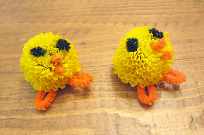 There were several  little “baby mums” in the bunch and they kept reminding me of fluffy little chicks. I thought it might be fun to make some flowery table decorations for the kid’s Easter table, so I snipped off a few yellow miniature mums and started playing…