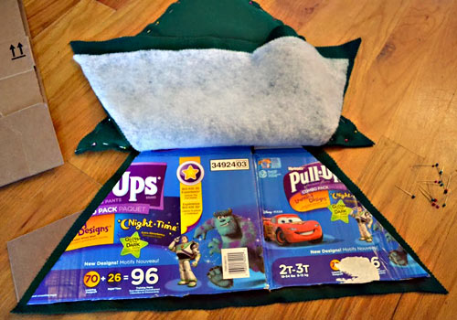 Step 2: To make your tree appear a little fuller, trace your tree on some batting and layer it between your two tree pieces. (You may need to trim the batting about ½ an inch so it didn’t show outside of your tree). To prevent your branches from curling in, trim your cardboard template a bit for stability. Now you’ll have a “tree sandwich” as seen above: green felt tree (the back of the tree), cardboard template, batting, green felt tree (the front of the tree).